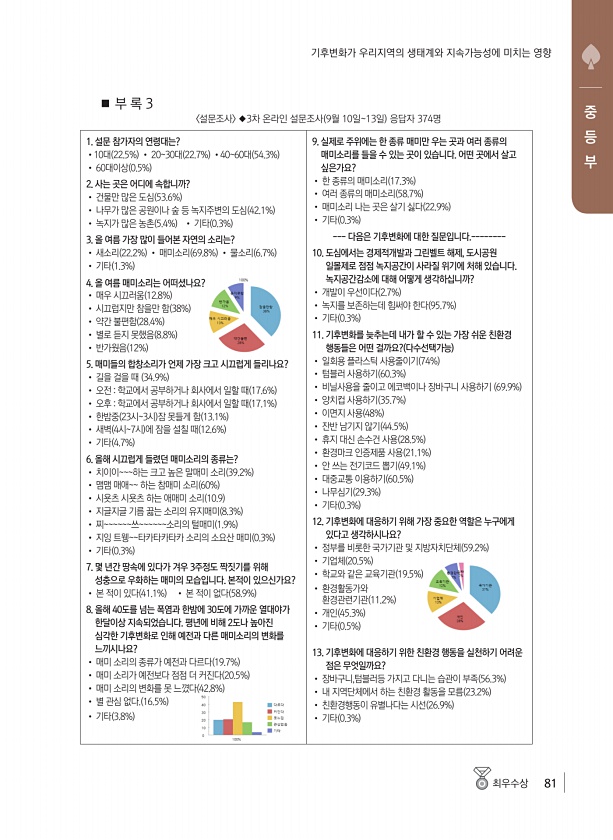 최우수상 81 중 등 부 기후변화가 우리지역의 생태계와 지속가능성에 미치는 영향 ■ 부 록 3 설문조사 ◆3차 온라인 설문조사 9월 10일13일 응답자 374명 1. 설문 참가자의 연령대는? ?10대 22.5% ? 2030대 22.7% ?4060대 54.3% ? 60대이상 0.5% 2. 사는 곳은 어디에 속합니까? ? 건물만 많은 도심 53.6% ? 나무가 많은 공원이나 숲 등 녹지주변의 도심 42.1% ? 녹지가 많은 농촌 5.4% ? 기타 0.3% 3. 올 여름 가장 많이 들어본 자연의 소리는? ? 새소리 22.2% ? 매미소리 69.8% ? 물소리 6.7% ? 기타 1.3% 4. 올 여름 매미소리는 어떠셨나요? ? 매우 시끄러움 12.8% ? 시끄럽지만 참을만 함 38% ? 약간 불편함 28.4% ? ...