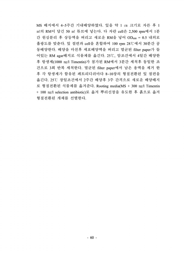 60 MS 배지에서 45주간 기내배양하였다. 잎을 약 1 ㎝ 크기로 자른 후 1 ㎖의 RM이 담긴 50 ㎖ 튜브에 넣는다. 다 자란 cell은 2,500 rpm에서 1분 간 원심분리 후 상등액을 버리고 새로운 RM을 넣어 OD600 = 0.5 내외로 흡광도를 맞춘다. 잎 절편과 cell을 혼합하여 100 rpm 28℃에서 30분간 공 동배양한다. 배양을 마친후 세포배양액을 버리고 멸균된 filter paper가 들 어있는 RM agar배지로 식물체를 옮긴다. 25℃, 암조건에서 4일간 배양한 후 항생제 1000 ㎎/l Timentin 가 첨가된 RM에서 3분간 세척후 동일한 조 건으로 3회 반복 세척한다. 멸균된 filter paper에서 남은 용액을 제거 한 후 각 항생제가 함유된 페트리디쉬마다 810장의...