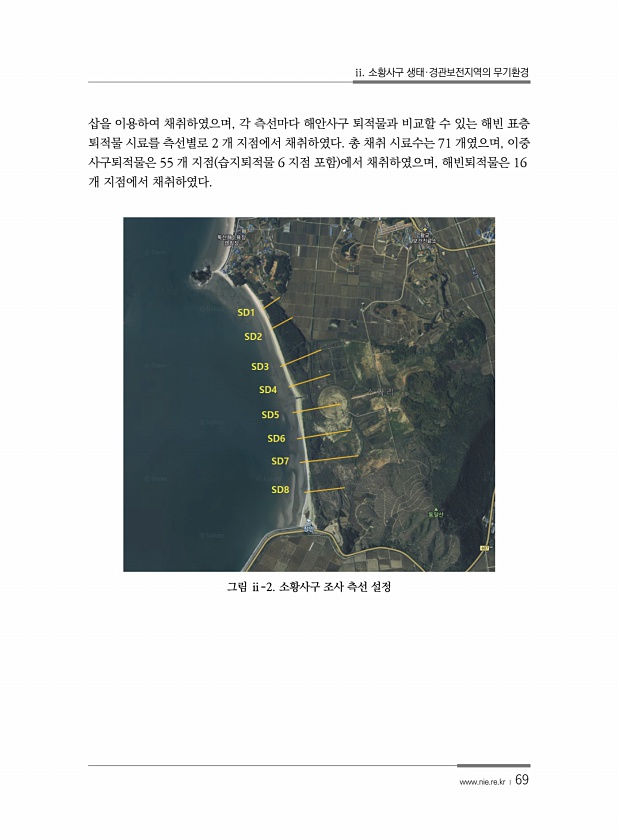 ii. 소황사구 생태·경관보전지역의 무기환경 www.nie.re.kr ? 69 삽을 이용하여 채취하였으며, 각 측선마다 해안사구 퇴적물과 비교할 수 있는 해빈 표층 퇴적물 시료를 측선별로 2 개 지점에서 채취하였다. 총 채취 시료수는 71 개였으며, 이중 사구퇴적물은 55 개 지점 습지퇴적물 6 지점 포함 에서 채취하였으며, 해빈퇴적물은 16 개 지점에서 채취하였다. 그림 ⅱ-2. 소황사구 조사 측선설정