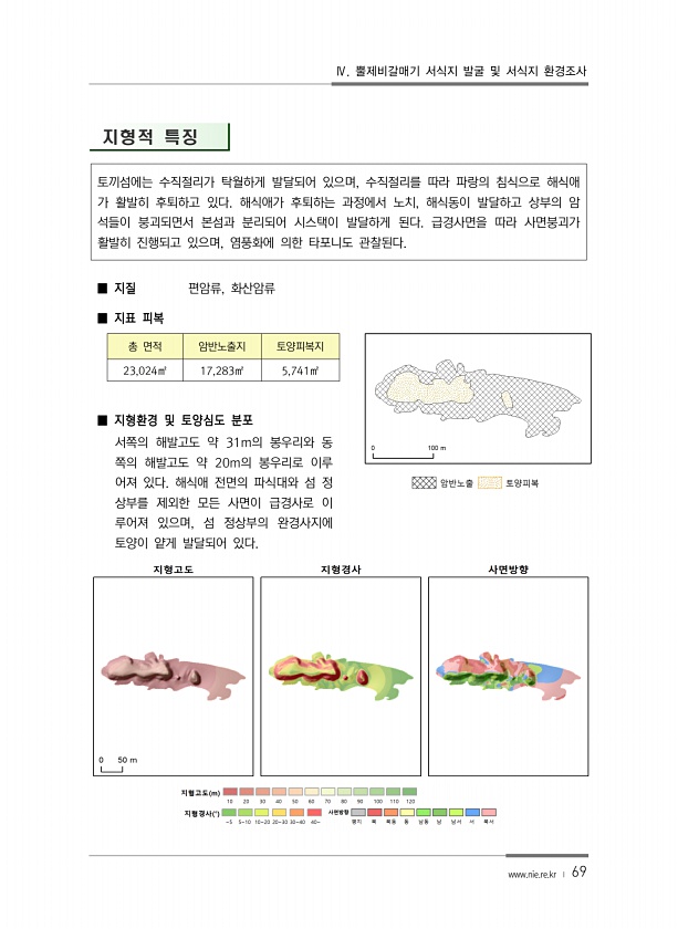 Ⅳ. 뿔제비갈매기 서식지 발굴 및 서식지 환경조사 www.nie.re.kr ? 69 지형적 특징 토끼섬에는 수직절리가 탁월하게 발달되어 있으며, 수직절리를 따라 파랑의 침식으로 해식애 가 활발히 후퇴하고 있다. 해식애가 후퇴하는 과정에서 노치, 해식동이 발달하고 상부의 암 석들이 붕괴되면서 본섬과 분리되어 시스택이 발달하게 된다. 급경사면을 따라 사면붕괴가 활발히 진행되고 있으며, 염풍화에 의한 타포니도 관찰된다. ■ 지질 편암류, 화산암류 ■ 지표 피복 총 면적 암반노출지 토양피복지 23,024㎡ 17,283㎡ 5,741㎡ ■ 지형환경 및 토양심도 분포 서쪽의 해발고도 약 31m의 봉우리와 동 쪽의 해발고도 약 20m의 봉우리로 이루 어져 있다. 해식애 전면의 파식대와 섬 정 상부를 제외한 모든 사면이 급...