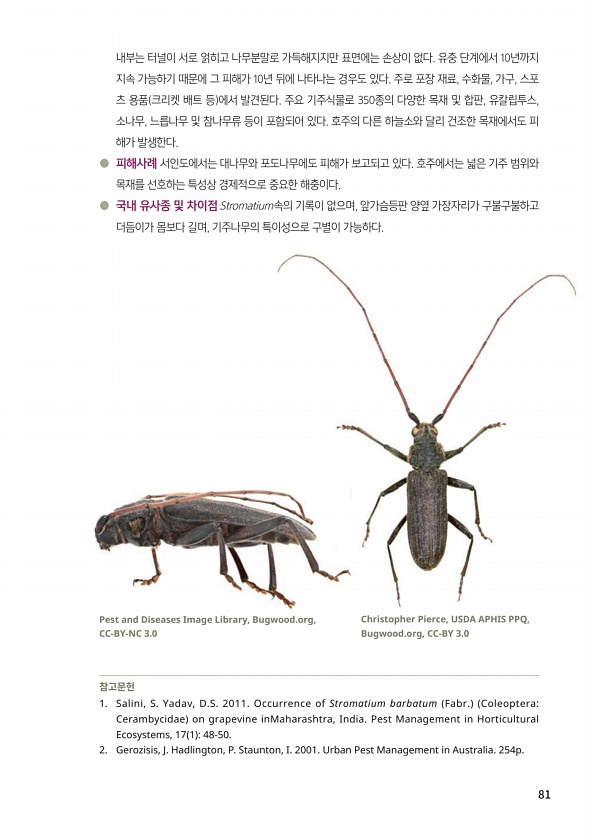 81 내부는 터널이 서로 얽히고 나무분말로 가득해지지만 표면에는 손상이 없다. 유충 단계에서 10년까지 지속 가능하기 때문에 그 피해가 10년 뒤에 나타나는 경우도 있다. 주로 포장 재료, 수화물, 가구, 스포 츠 용품 크리켓 배트 등 에서 발견된다. 주요 기주식물로 350종의 다양한 목재 및 합판, 유칼립투스, 소나무, 느릅나무 및 참나무류 등이 포함되어 있다. 호주의 다른 하늘소와 달리 건조한 목재에서도 피 해가 발생한다. ● 피해사례 서인도에서는 대나무와 포도나무에도 피해가 보고되고 있다. 호주에서는 넓은 기주 범위와 목재를 선호하는 특성상 경제적으로 중요한 해충이다. ● 국내 유사종 및 차이점 Stromatium속의 기록이 없으며, 앞가슴등판 양옆 가장자리가 구불구불하고 더듬이가 몸보다 길며, 기주나...