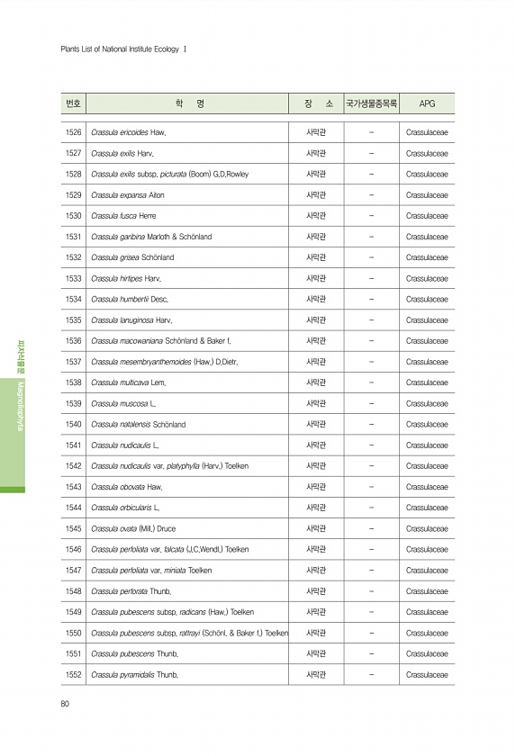 80 번호 학 명 장 소 국가생물종목록 APG 피자식물문 Magnoliophyta Plants List of National Institute Ecology Ⅰ 1526 Crassula ericoides Haw. 사막관 Crassulaceae 1527 Crassula exilis Harv. 사막관 Crassulaceae 1528 Crassula exilis subsp. picturata Boom G.D.Rowley 사막관 Crassulaceae 1529 Crassula expansa Aiton 사막관 Crassulaceae 1530 Crassula fusca Herre 사막관 Crassulaceae 1531 Crassula garibina Marloth & Sch?nland 사막관 Crassulaceae 1...