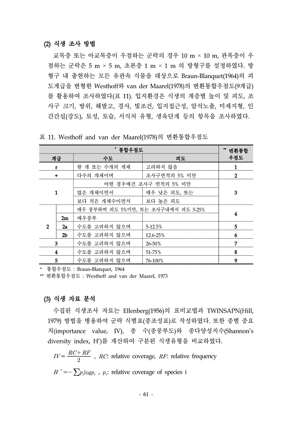 61 2 식생 조사 방법 교목층 또는 아교목층이 우점하는 군락의 경우 10 m × 10 m, 관목층이 우 점하는 군락은 5 m × 5 m, 초본층 1 m × 1 m 의 방형구를 설정하였다. 방 형구 내 출현하는 모든 유관속 식물을 대상으로 Braun-Blanquet 1964 의 피 도계급을 변형한 Westhoff와 van der Maarel 1978 의 변환통합우점도 9계급 를 활용하여 조사하였다 표 11 입지환경은 식생의 계층별 높이 및 피도, 조 사구 크기, 방위, 해발고, 경사, 빛조건, 입지접근성, 암석노출, 미세지형, 인 간간섭 강도 , 토성, 토습, 서식처 유형, 생육단계 등의 항목을 조사하였다. * 통합우점도 ** 변환통합 계급 수도 피도 우점도 r 한 개 또는 수개의 개체 고려하지 않음 1 +...