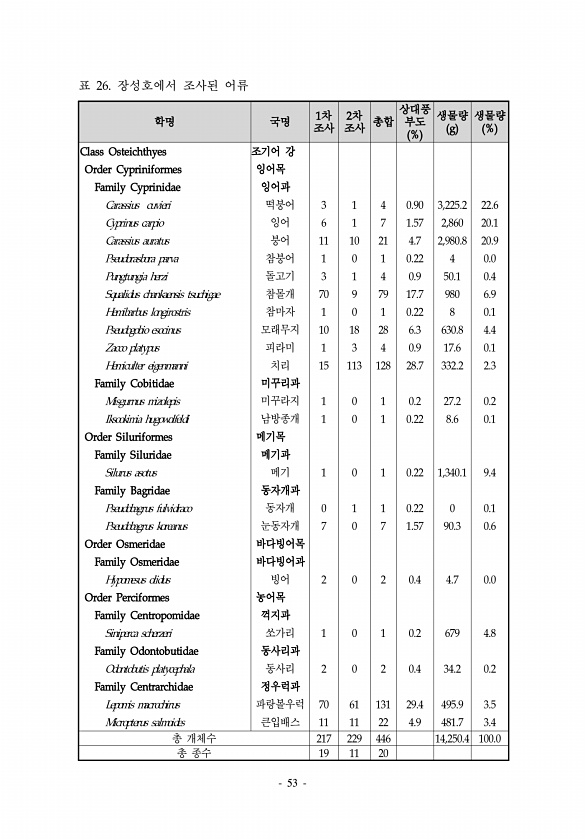 53 학명 국명 1차 조사 2차 조사 총합 상대풍 부도 % 생물량 g 생물량 % Class Osteichthyes 조기어 강 Order Cypriniformes 잉어목 Family Cyprinidae 잉어과 Carassius cuvieri 떡붕어 3 1 4 0.90 3,225.2 22.6 Cyprinus carpio 잉어 6 1 7 1.57 2,860 20.1 Carassius auratus 붕어 11 10 21 4.7 2,980.8 20.9 Pseudorasbora parva 참붕어 1 0 1 0.22 4 0.0 Pungtungia herzi 돌고기 3 1 4 0.9 50.1 0.4 Squalidus chankaensis tsuchigae 참몰개 70 9 79 17.7 980 6.9 Hemibarbus l...