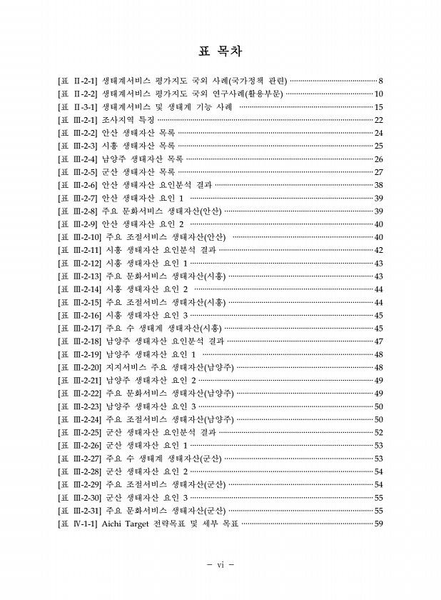 표 목차 [표 Ⅱ-2-1] 생태계서비스 평가지도 국외 사례 국가정책 관련 ··········································8 [표 Ⅱ-2-2] 생태계서비스 평가지도 국외 연구사례 활용부문 ··········································10 [표 Ⅱ-3-1] 생태계서비스 및 생태계 기능 사례 ·································································15 [표 Ⅲ-2-1] 조사지역 특징 ·········································································································22 [표 Ⅲ-2-2] 안산...
