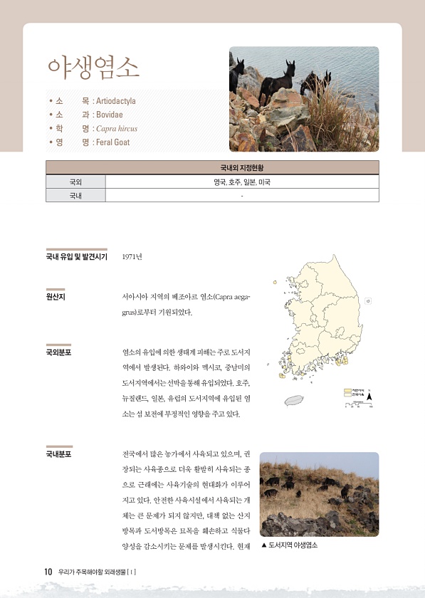 10 우리가 주목해야할 외래생물 [Ⅰ] 국내 유입 및 발견시기 1971년 원산지 서아시아 지역의 베조아르 염소 Capra aegagrus 로부터 기원되었다. 국외분포 염소의 유입에 의한 생태계 피해는 주로 도서지 역에서 발생된다. 하와이와 멕시코, 중남미의 도서지역에서는선박을통해유입되었다.호주, 뉴질랜드, 일본, 유럽의 도서지역에 유입된 염 소는 섬 보전에 부정적인 영향을 주고 있다. 국내분포 전국에서 많은 농가에서 사육되고 있으며, 권 장되는 사육종으로 더욱 활발히 사육되는 종 으로 근래에는 사육기술의 현대화가 이루어 지고 있다. 안전한 사육시설에서 사육되는 개 체는 큰 문제가 되지 않지만, 대책 없는 산지 방목과 도서방목은 묘목을 훼손하고 식물다 양성을 감소시키는 문제를 발생시킨다. 현재 ? 소 목 Ar...