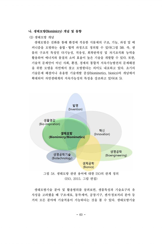 60 나. 생태모방 Biomimicry 개념 및 동향 1 생태모방 개념 생태모방은 진화를 통해 환경에 적응한 식물체의 구조, 기능, 과정 및 메 커니즘을 모방하는 융합·협력 과정으로 정의될 수 있다 그림 58 즉, 생 물의 구조적 특징인 다기능성, 적응성, 회복탄력성 및 자기조직화 능력을 활용하여 에너지와 물질의 소비 효율이 높은 기술을 개발할 수 있다. 또한, 기술적 문제만이 아닌 사회, 환경, 경제의 통합적 지속가능발전의 문제해결 을 위한 모델을 자연에서 찾고 모방한다는 의미도 내포하고 있다. 초기의 기술문제 해결이나 유용한 기술개발 중심 biomimetics, bionics 의 개념에서 확대되어 자연생태계의 지속가능성의 특징을 강조하고 있다 표 5 그림 58. 생태모방 관련 용어에 대한 ISO의 관계 ...