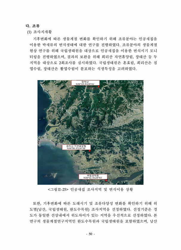 50 다. 조류 1 조사지개황 기후변화에 따른 생물계절 변화를 확인하기 위해 조류분야는 인공새집을 이용한 박새류의 번식생태에 대한 연구를 진행하였다. 조류분야의 생물계절 현상 연구를 위해 국립생태원을 대상으로 인공새집을 이용한 번식시기 모니 터링을 진행하였으며, 결과의 보완을 위해 희리산 자연휴양림, 장태산 등 두 지역을 대상으로 2회조사를 실시하였다. 국립생태원은 혼효림, 희리산은 침 엽수림, 장태산은 활엽수림이 분포하는 식생특성을 고려하였다. 그림Ⅱ-25 인공새집 조사지역 및 번식이용 상황 또한, 기후변화에 따른 도래시기 및 조류다양성 변화를 확인하기 위해 위 도별 남산, 국립생태원, 완도수목원 조사지역을 선정하였다. 선정기준은 경 도가 동일한 선상내에서 위도차이가 있는 지역을 우선적으로 선정하였다. 본...