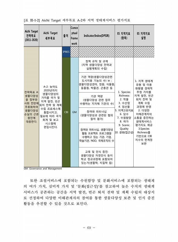 69 Aichi Target 전략목표 2011-2020 Aichi Target 세부목표 출처 Conce ptual Frame work Indicator/Index DPSIR ES 지역지표 항목 ES 지역지표 설명 전략목표 A생물다양성 을 정부와 사회 전반에 주류화하여 생물다양성 손실의 근본 원인에 대응한다. A-2늦어도 2020년까지 생물다양성의 가치를 국가 및 지역 발전, 빈곤 퇴치 전략 및 계획 수립 프로세스에 통합시키고, 필요에 따라 국가 회계 및 보고 시스템에 편입시킨다. IPBES CBI GM 정책 규칙 및 규제 지역 생물다양성 전략과 실행계획의 수립 1. Species Richness 2. 작물 3. 수산업 4. 임산물 5. 지역고유지표 6. 담수 7. 수원함양 8. 여가 9. Scenic Qua...