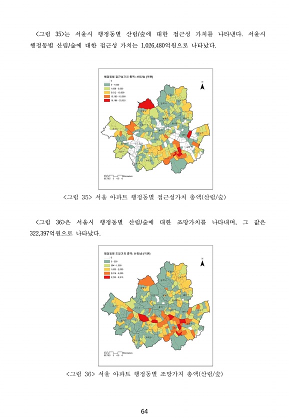 64 그림 35 는 서울시 행정동별 산림/숲에 대한 접근성 가치를 나타낸다. 서울시 행정동별 산림/숲에 대한 접근성 가치는 1,026,480억원으로 나타났다. 그림 35 서울 아파트 행정동별 접근성가치 총액 산림/숲 그림 36 은 서울시 행정동별 산림/숲에 대한 조망가치를 나타내며, 그 값은 322,397억원으로 나타났다. 그림 36 서울 아파트 행정동별 조망가치 총액 산림/숲