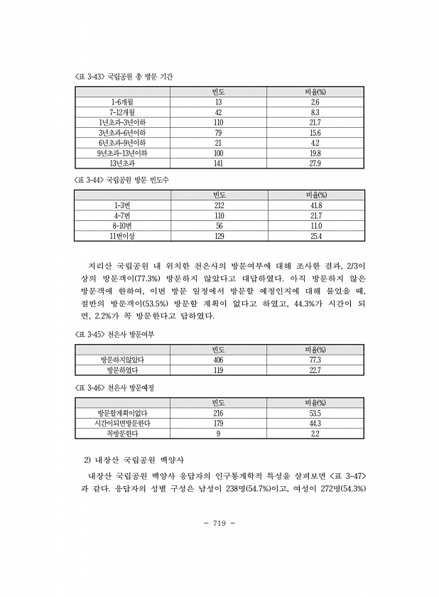 719 빈도 비율 % 1-6개월 13 2.6 7-12개월 42 8.3 1년초과-3년이하 110 21.7 3년초과-6년이하 79 15.6 6년초과-9년이하 21 4.2 9년초과-13년이하 100 19.8 13년초과 141 27.9 표 3-43 국립공원 총 방문 기간 빈도 비율 % 1-3번 212 41.8 4-7번 110 21.7 8-10번 56 11.0 11번이상 129 25.4 표 3-44 국립공원 방문 빈도수 지리산 국립공원 내 위치한 천은사의 방문여부에 대해 조사한 결과, 2/3이 상의 방문객이 77.3% 방문하지 않았다고 대답하였다. 아직 방문하지 않은 방문객에 한하여, 이번 방문 일정에서 방문할 예정인지에 대해 물었을 때, 절반의 방문객이 53.5% 방문할 계획이 없다고 하였고, 44.3%가 시간이 ...