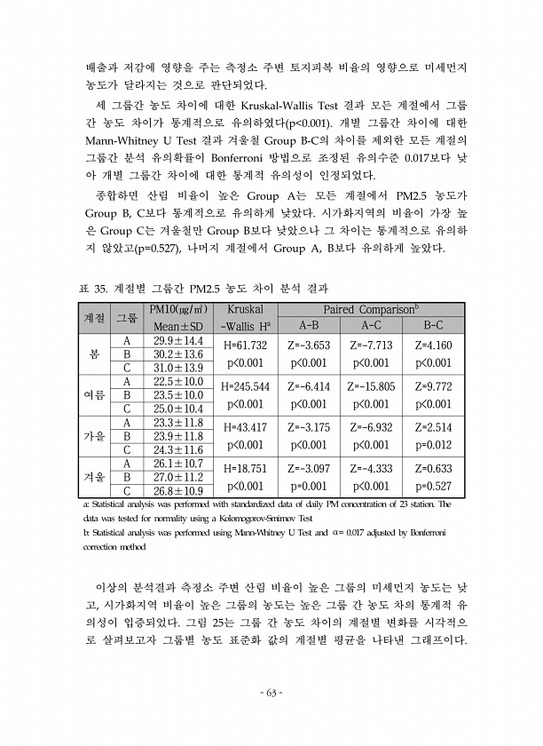 63 배출과 저감에 영향을 주는 측정소 주변 토지피복 비율의 영향으로 미세먼지 농도가 달라지는 것으로 판단되었다 세 그룹간 농도 차이에 대한 결과 모든 계절에서 그룹 간 농도 차이가 통계적으로 유의하였다 개별 그룹간 차이에 대한 결과 겨울철 의 차이를 제외한 모든 계절의 그룹간 분석 유의확률이 방법으로 조정된 유의수준 보다 낮 아 개별 그룹간 차이에 대한 통계적 유의성이 인정되었다 종합하면 산림 비율이 높은 는 모든 계절에서 농도가 보다 통계적으로 유의하게 낮았다 시가화지역의 비율이 가장 높 은 는 겨울철만 보다 낮았으나 그 차이는 통계적으로 유의하 지 않았고 나머지 계절에서 보다 유의하게 높았다 계절 그룹 PM10 ㎍/㎥ Mean±SD Kruskal -Wallis Ha Paired Comparisonb A...
