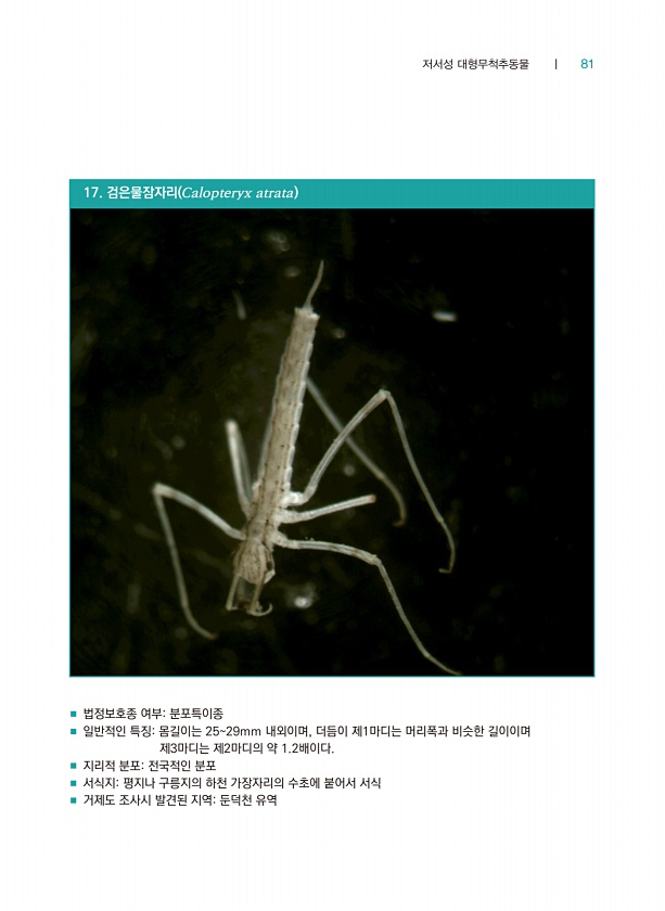 저서성 대형무척추동물 ┃ 81 17. 검은물잠자리 Calopteryx atrata ■ 법정보호종 여부분포특이종 ■ 일반적인 특징몸길이는 2529mm 내외이며, 더듬이 제1마디는 머리폭과 비슷한 길이이며 제3마디는 제2마디의 약 1.2배이다. ■ 지리적 분포전국적인 분포 ■ 서식지평지나 구릉지의 하천 가장자리의 수초에 붙어서 서식 ■ 거제도 조사시 발견된 지역둔덕천유역