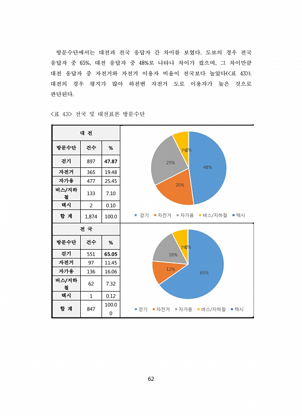 62 방문수단에서는 대전과 전국 응답자 간 차이를 보였다. 도보의 경우 전국 응답자 중 65%, 대전 응답자 중 48%로 나타나 차이가 컸으며, 그 차이만큼 대전 응답자 중 자전거와 자전거 이용자 비율이 전국보다 높았다 표 43 대전의 경우 평지가 많아 하천변 자전거 도로 이용자가 높은 것으로 판단된다. 표 43 전국 및 대전표본 방문수단 대 전 방문수단 건수 % 걷기 897 47.87 자전거 365 19.48 자가용 477 25.45 버스/지하 철 133 7.10 택시 2 0.10 합 계 1,874 100.0 전 국 방문수단 건수 % 걷기 551 65.05 자전거 97 11.45 자가용 136 16.06 버스/지하 철 62 7.32 택시 1 0.12 합 계 847 100.0 0 48% 20% 25% 7%0...