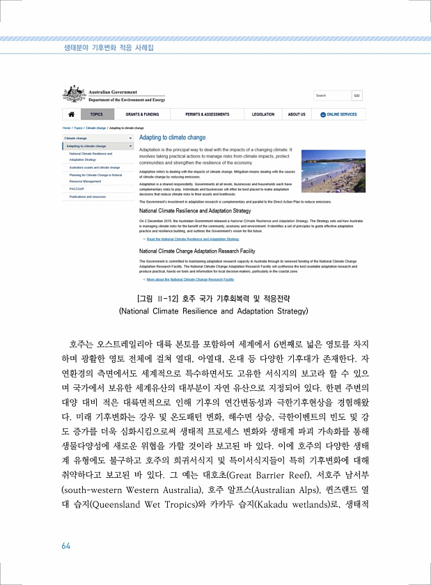 생태분야 기후변화 적응 사례집 64 [그림 Ⅱ-12] 호주 국가 기후회복력 및 적응전략 National Climate Resilience and Adaptation Strategy 호주는 오스트레일리아 대륙 본토를 포함하여 세계에서 6번째로 넓은 영토를 차지 하며 광활한 영토 전체에 걸쳐 열대, 아열대, 온대 등 다양한 기후대가 존재한다. 자 연환경의 측면에서도 세계적으로 특수하면서도 고유한 서식지의 보고라 할 수 있으 며 국가에서 보유한 세계유산의 대부분이 자연 유산으로 지정되어 있다. 한편 주변의 대양 대비 적은 대륙면적으로 인해 기후의 연간변동성과 극한기후현상을 경험해왔 다. 미래 기후변화는 강우 및 온도패턴 변화, 해수면 상승, 극한이벤트의 빈도 및 강 도 증가를 더욱 심화시킴으로써 생태적 프로세스 ...