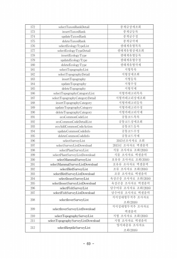 69 172 selectTaxonRankDetail 종계급상세조회? insertTaxonRank 종계급8록 17. updateTaxonRank 종계급수 175 deleteTaxonRank 종계급?DTDpeList 생태계유형목록?DTDpeDetail 생태계유형상세조회?DTDpe 생태계유형8록?DTDpe 생태계유형수?DTDpe 생태계유형?rap&DList 지형목록?rap&DDetail 지형상세조회??rap&D 지형8록?rap&D 지형수?rap&D 지형?rap&?orDList 지형§¨?ª목록?rap&?orDDetail 지형§¨?ª상세조회?rap&?orD 지형§¨?ª8록?rap&?orD 지형§¨?ª수?rap&?orD 지형§¨?ª@A 1B1 ecoCommonCodeList 공통코드목록 1B2 ecoCommonCode...