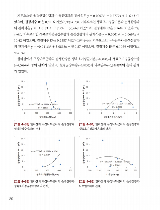 80 기후요소인 월평균강수량과 순생산량과의 관계식은 y = 0.0007x2 0.7777x + 216.43 이 었으며, 결정계수 R2은 0.8016 이었다 그림 4-63 기후요소인 생육초기평균기온과 순생산량과 의 관계식은 y = -1.6171x2 + 17.29x 35.669 이었으며, 결정계수 R2은 0.2689 이었다 그림 4-64 기후요소인 생육초기평균강수량과 순생산량과의 관계식은 y = 0.0001x2 0.0697x + 10.42 이었으며, 결정계수 R2은 0.2587 이었다 그림 4-65 기후요소인 나무일수와 순생산량과 의 관계식은 y = -0.0116x2 + 5.0898x 550.87 이었으며, 결정계수 R2은 0.1065 이었다 그 림 4-66 한라산에서 구상나무군락의 순생산량은 생육초기평균기온 r...