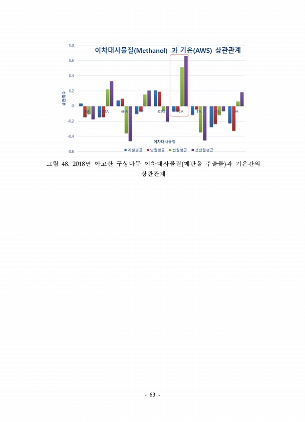 63 그림 48. 2018년 아고산 구상나무 이차대사물질 메탄올 추출물 과 기온간의상관관계
