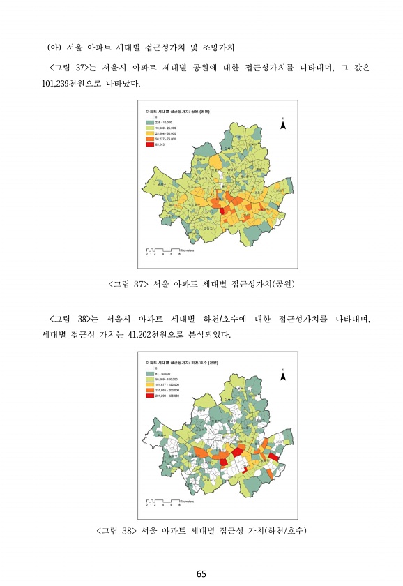 65 아 서울 아파트 세대별 접근성가치 및 조망가치 그림 37 는 서울시 아파트 세대별 공원에 대한 접근성가치를 나타내며, 그 값은 101,239천원으로 나타났다. 그림 37 서울 아파트 세대별 접근성가치 공원 그림 38 는 서울시 아파트 세대별 하천/호수에 대한 접근성가치를 나타내며, 세대별 접근성 가치는 41,202천원으로 분석되었다. 그림 38 서울 아파트 세대별 접근성 가치 하천/호수