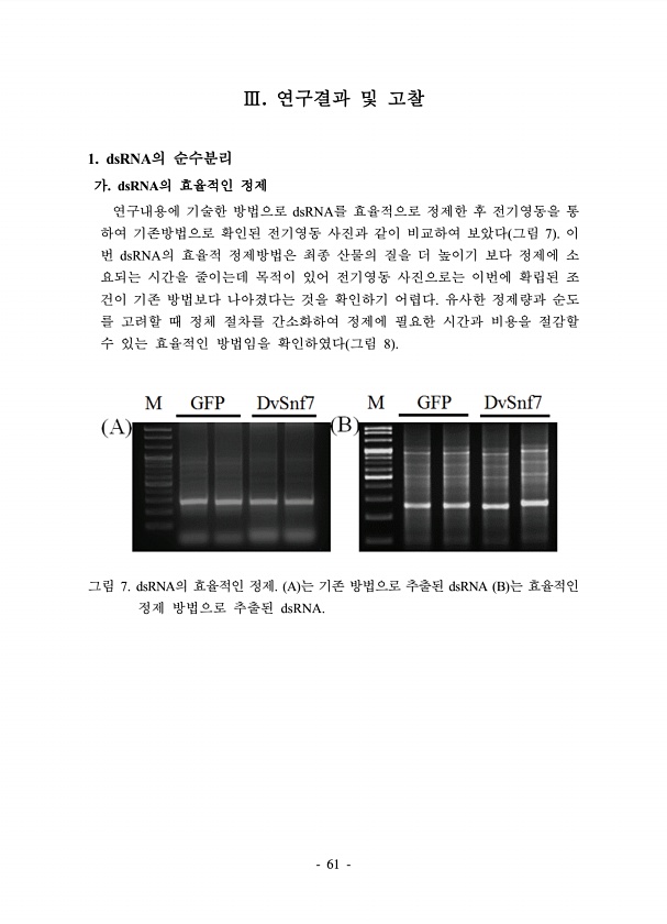 61 Ⅲ. 연구결과 및 고찰 1. dsRNA의 순수분리 가. dsRNA의 효율적인 정제 연구내용에 기술한 방법으로 dsRNA를 효율적으로 정제한 후 전기영동을 통 하여 기존방법으로 확인된 전기영동 사진과 같이 비교하여 보았다 그림 7 이 번 dsRNA의 효율적 정제방법은 최종 산물의 질을 더 높이기 보다 정제에 소 요되는 시간을 줄이는데 목적이 있어 전기영동 사진으로는 이번에 확립된 조 건이 기존 방법보다 나아졌다는 것을 확인하기 어렵다. 유사한 정제량과 순도 를 고려할 때 정체 절차를 간소화하여 정제에 필요한 시간과 비용을 절감할 수 있는 효율적인 방법임을 확인하였다 그림 8 그림 7. dsRNA의 효율적인 정제. A 는 기존 방법으로 추출된 dsRNA B 는 효율적인 정제 방법으로 추출된dsRNA.