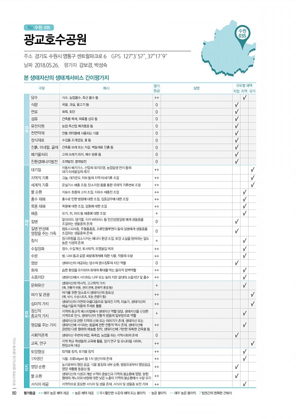 No. 수원- 수원 035 본 생태자산의 생태계서비스 간이평가지 구분 예시 평가 등급 설명 규모별 혜택 지점 지역 국가 공급 담수 식수, 농업용수, 축산 용수 등 ++ √ 식량 곡물, 과실, 물고기 등 0 √ 연료 화목, 토탄 0 √ 섬유 건축용 목재, 의류용 섬유 등 0 √ 유전자원 농업·축산업 희귀품종 등 0 √ 천연약재 전통 의약품에 사용되는 식물 0 √ 장식재료 수집용 조개껍질, 꽃 등 0 √ 진흙, 미네랄, 골재 건축용 모래 또는 자갈, 벽돌재료 진흙 등 0 √ 폐기물처리 고체 쓰레기 하치, 폐수 방류 등 0 √ 친환경에너지발전 조력발전, 풍력발전 0 √ 조절 대기질 자동차 배기가스, 산업체 대기오염, 농업발생 먼지 등의 대기 미세물질의 제거 ++ √ 지역적 기후 그늘, 대기온도 저하 등의 지역 미...