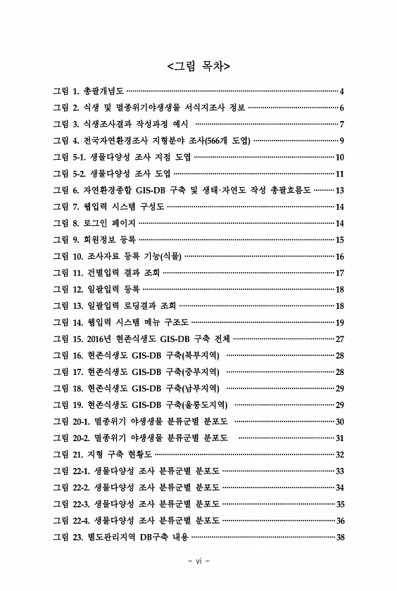 vi 그림 목차 그림 1. 총괄개념도 ········································································································4 그림 2. 식생 및 멸종위기야생생물 서식지조사 정보 ············································6 그림 3. 식생조사결과 작성과정 예시 ······································································7 그림 4. 전국자연환경조사 지형분야 조사 566개 도엽 ··········································9 그림 5-1. 생물다양성 조사 지점 도엽 ·······...