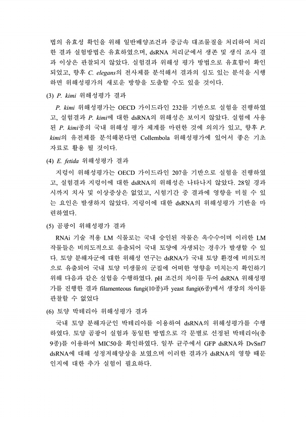 법의 유효성 확인을 위해 일반배양조건과 중금속 대조물질을 처리하여 처리 한 결과 실험방법은 유효하였으며, dsRNA 처리군에서 생존 및 생식 조사 결 과 이상은 관찰되지 않았다. 실험결과 위해성 평가 방법으로 유효함이 확인 되었고, 향후 C. elegans의 전사체를 분석해서 결과의 심도 있는 분석을 시행 하면 위해성평가의 새로운 방향을 도출할 수도 있을 것이다. 3 P. kimi 위해성평가 결과 P. kimi 위해성평가는 OECD 가이드라인 232를 기반으로 실험을 진행하였 고, 실험결과 P. kimi에 대한 dsRNA의 위해성은 보이지 않았다. 실험에 사용 된 P. kimi종의 국내 위해성 평가 체계를 마련한 것에 의의가 있고, 향후 P. kimi의 유전체를 분석해본다면 Collembola 위해성평가에 ...