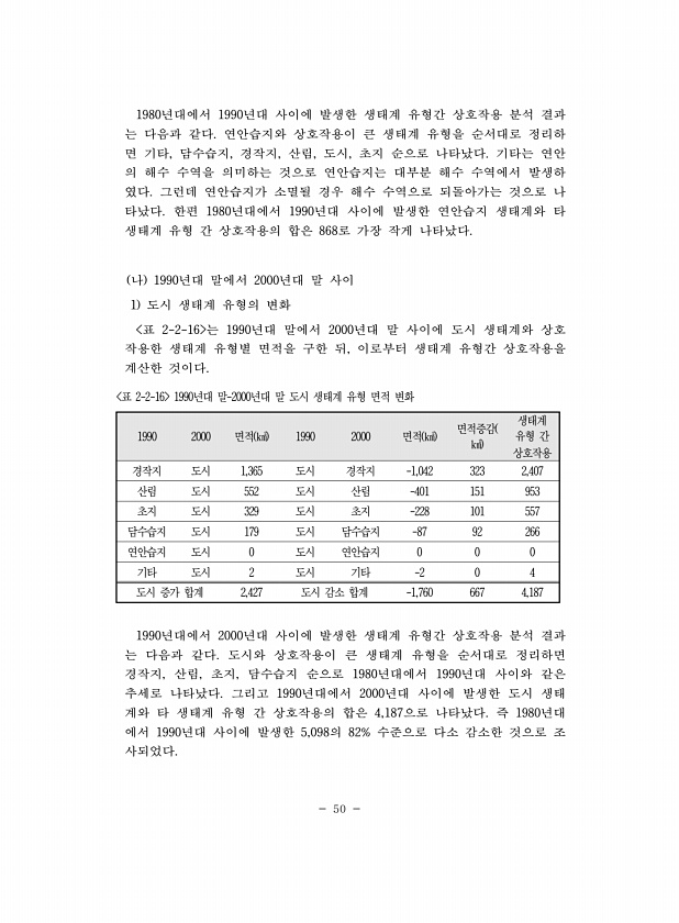 50 1980년대에서 1990년대 사이에 발생한 생태계 유형간 상호작용 분석 결과 는 다음과 같다. 연안습지와 상호작용이 큰 생태계 유형을 순서대로 정리하 면 기타, 담수습지, 경작지, 산림, 도시, 초지 순으로 나타났다. 기타는 연안 의 해수 수역을 의미하는 것으로 연안습지는 대부분 해수 수역에서 발생하 였다. 그런데 연안습지가 소멸될 경우 해수 수역으로 되돌아가는 것으로 나 타났다. 한편 1980년대에서 1990년대 사이에 발생한 연안습지 생태계와 타 생태계 유형 간 상호작용의 합은 868로 가장 작게 나타났다. 나 1990년대 말에서 2000년대 말 사이 1 도시 생태계 유형의 변화 표 2-2-16 는 1990년대 말에서 2000년대 말 사이에 도시 생태계와 상호 작용한 생태계 유형별 면적을 구한 뒤,...