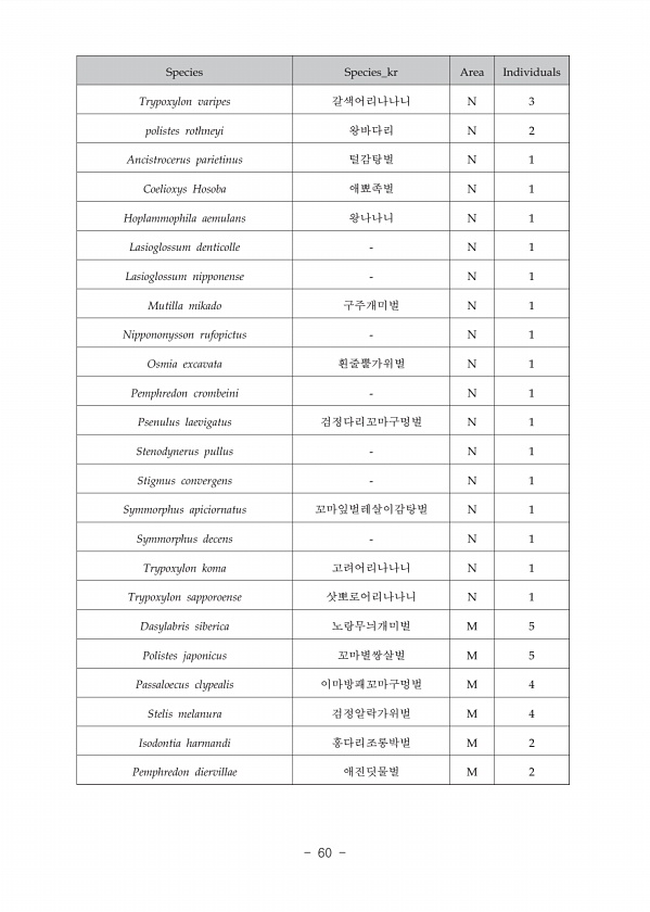 Species Species_kr Area Individuals Trypoxylon varipes ?? N 3 polistes rothneyi N 2 Ancistrocerus parietinus N 1 Coelioxys Hosoba N 1 Hoplammophila aemulans ?? N 1 Lasioglossum denticolle N 1 Lasioglossum nipponense N 1 Mutilla mikado N 1 Nippononysson rufopictus N 1 Osmia excavata N 1 Pemphredon crombeini N 1 Psenulus laevigatus ? N 1 Stenodynerus pullus N 1 Stigmus convergens N 1 Symmorphus apic...