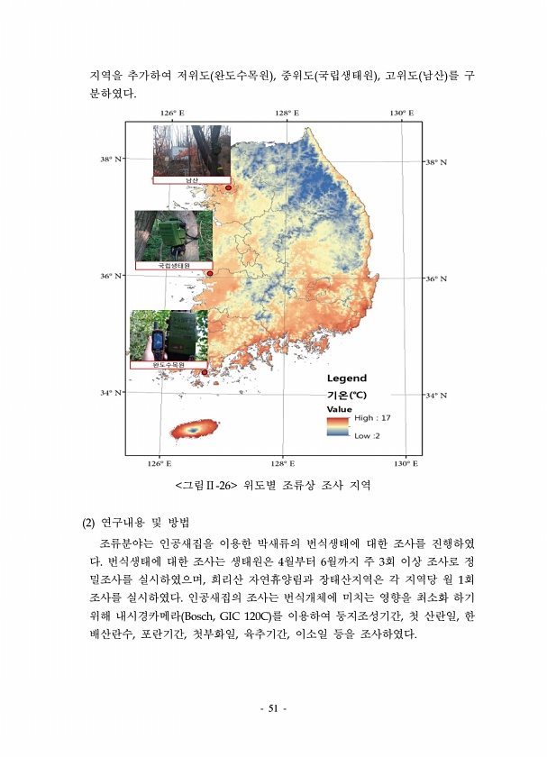 51 지역을 추가하여 저위도 완도수목원 , 중위도 국립생태원 , 고위도 남산 를 구 분하였다. 그림Ⅱ-26 위도별 조류상 조사 지역 2 연구내용 및 방법 조류분야는 인공새집을 이용한 박새류의 번식생태에 대한 조사를 진행하였 다. 번식생태에 대한 조사는 생태원은 4월부터 6월까지 주 3회 이상 조사로 정 밀조사를 실시하였으며, 희리산 자연휴양림과 장태산지역은 각 지역당 월 1회 조사를 실시하였다. 인공새집의 조사는 번식개체에 미치는 영향을 최소화 하기 위해 내시경카메라 Bosch, GIC 120C 를 이용하여 둥지조성기간, 첫 산란일, 한 배산란수, 포란기간, 첫부화일, 육추기간, 이소일 등을조사하였다.
