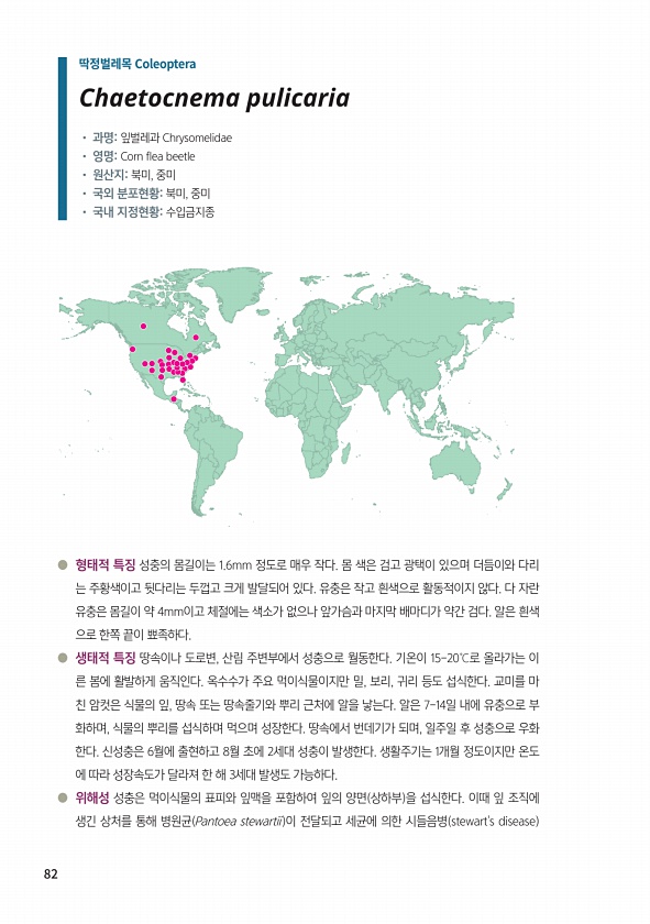 82 ● 형태적 특징 성충의 몸길이는 1.6mm 정도로 매우 작다. 몸 색은 검고 광택이 있으며 더듬이와 다리 는 주황색이고 뒷다리는 두껍고 크게 발달되어 있다. 유충은 작고 흰색으로 활동적이지 않다. 다 자란 유충은 몸길이 약 4mm이고 체절에는 색소가 없으나 앞가슴과 마지막 배마디가 약간 검다. 알은 흰색 으로 한쪽 끝이 뾰족하다. ● 생태적 특징 땅속이나 도로변, 산림 주변부에서 성충으로 월동한다. 기온이 15-20℃로 올라가는 이 른 봄에 활발하게 움직인다. 옥수수가 주요 먹이식물이지만 밀, 보리, 귀리 등도 섭식한다. 교미를 마 친 암컷은 식물의 잎, 땅속 또는 땅속줄기와 뿌리 근처에 알을 낳는다. 알은 7-14일 내에 유충으로 부 화하며, 식물의 뿌리를 섭식하며 먹으며 성장한다. 땅속에서 번데기가...