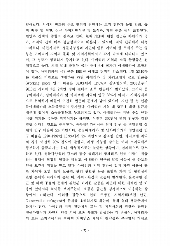 일어났다. 서식지 변화의 주요 인위적 원인에는 토지 전환과 농업 강화, 습 지 배수 및 전환, 신규 사회기반시설 및 도시화, 자원 추출 등이 포함된다. 원인과 정책의 종합적 결과로 인해, 현재 NCP에 대한 접근은 아메리카 국 가, 소지역 간에 매우 불균형적으로 배분되고 있으며, 지역 단위에서 더욱 그러하다. 마찬가지로, 생물다양성과 자연의 인류 기여의 현 추세가 주는 영 향은 아메리카 지역의 문화 및 지역사회에서도 각기 다르게 나타나고 있으 며, 그 정도가 명백하게 증가하고 있다. 아메리카 지역의 소득 불평등은 전 체적으로 높다. 세계 50대 불평등 국가 중에 6개 국가가 아메리카에 포함되 어 있다. 아메리카의 극빈곤은 1981년 이래로 현저히 감소했다. 1일 $3.10라 는 빈곤선 미만으로 생활하는 라틴...