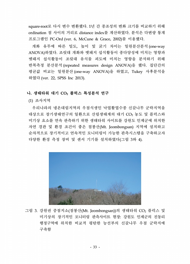 33 square-root로 다시 변수 변환했다. 1년 간 종조성의 변화 크기를 비교하기 위해 ordination 점 사이의 거리로 distance index를 계산하였다. 분석은 다변량 통계 프로그램인 PC-Ord ver. 6, McCune & Grace, 2002 를 이용했다. 개화 유무에 따른 밀도, 높이 및 굵기 차이는 일원분산분석 one-way ANOVA 하였다. 조릿대 개화와 멧돼지 섭식활동이 종다양성에 미치는 영향과 멧돼지 섭식활동이 조릿대 유식물 피도에 미치는 영향을 분석하기 위해 반복측정 분산분석 repeated measures design ANOVA 을 했다. 집단간의 평균값 비교는 일원분산 one-way ANOVA 을 하였고, Tukey 사후분석을 하였다 ver. 22, SPSS Inc ...