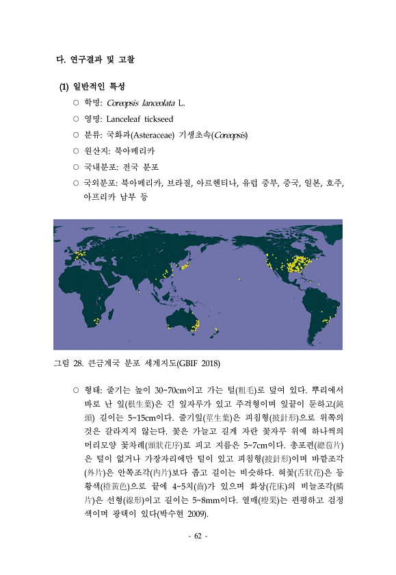 62 다. 연구결과 및 고찰 1 일반적인 특성 ○ 학명Coreopsis lanceolata L. ○ 영명Lanceleaf tickseed ○ 분류국화과 Asteraceae 기생초속 Coreopsis ○ 원산지북아메리카 ○ 국내분포전국 분포 ○ 국외분포북아메리카, 브라질, 아르헨티나, 유럽 중부, 중국, 일본, 호주, 아프리카 남부 등 그림 28. 큰금계국 분포 세계지도 GBIF 2018 ○ 형태줄기는 높이 3070cm이고 가는 털 粗毛 로 덮여 있다. 뿌리에서 바로 난 잎 根生葉 은 긴 잎자루가 있고 주걱형이며 잎끝이 둔하고 鈍 頭 길이는 515cm이다. 줄기잎 莖生葉 은 피침형 披針形 으로 위쪽의 것은 갈라지지 않는다. 꽃은 가늘고 길게 자란 꽃자루 위에 하나씩의 머리모양 꽃차례 頭狀花序 로 피고 지름은 ...