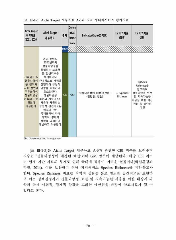 70 Aichi Target 전략목표 2011-2020 Aichi Target 세부목표 출처 Conce ptual Frame work Indicator/Index DPSIR ES 지역지표 항목 ES 지역지표 설명 전략목표 A생물다양성 을 정부와 사회 전반에 주류화하여 생물다양성 손실의 근본 원인에 대응한다. A-3늦어도 2020년까지 생물다양성을 위협하는 보조금 등 인센티브를 제거하거나 단계적으로 개혁을 실행하여 부정적 영향을 피하거나 최소화한다. 생물다양성 보존과 지속가능한 사용에 제공되는 긍정적 인센티브는 협약과 관련 국제규약에 따라 사회적, 경제적 상황을 고려하여 개발하고 적용한다. IPBES CBI GM 생물다양성에 배정된 예산 원단위천원 1. Species Richness Species Richne...