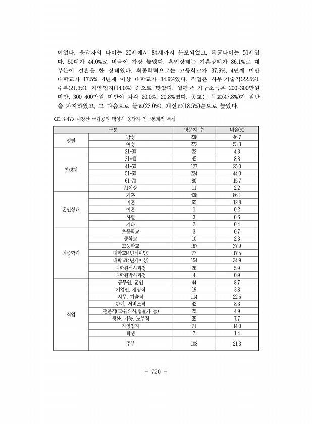 720 구분 방문자 수 비율 % 성별 남성 238 46.7 여성 272 53.3 연령대 21-30 22 4.3 31-40 45 8.8 41-50 127 25.0 51-60 224 44.0 61-70 80 15.7 71이상 11 2.2 혼인상태 기혼 438 86.1 미혼 65 12.8 이혼 1 0.2 사별 3 0.6 기타 2 0.4 최종학력 초등학교 3 0.7 중학교 10 2.3 고등학교 167 37.9 대학교 4년제미만 77 17.5 대학교 4년제이상 154 34.9 대학원석사과정 26 5.9 대학원박사과정 4 0.9 직업 공무원, 군인 44 8.7 기업인, 경영직 19 3.8 사무, 기술직 114 22.5 판매, 서비스직 42 8.3 전문직 교수,의사,법률가 등 25 4.9 생산, 기능, 노무직 39 7....