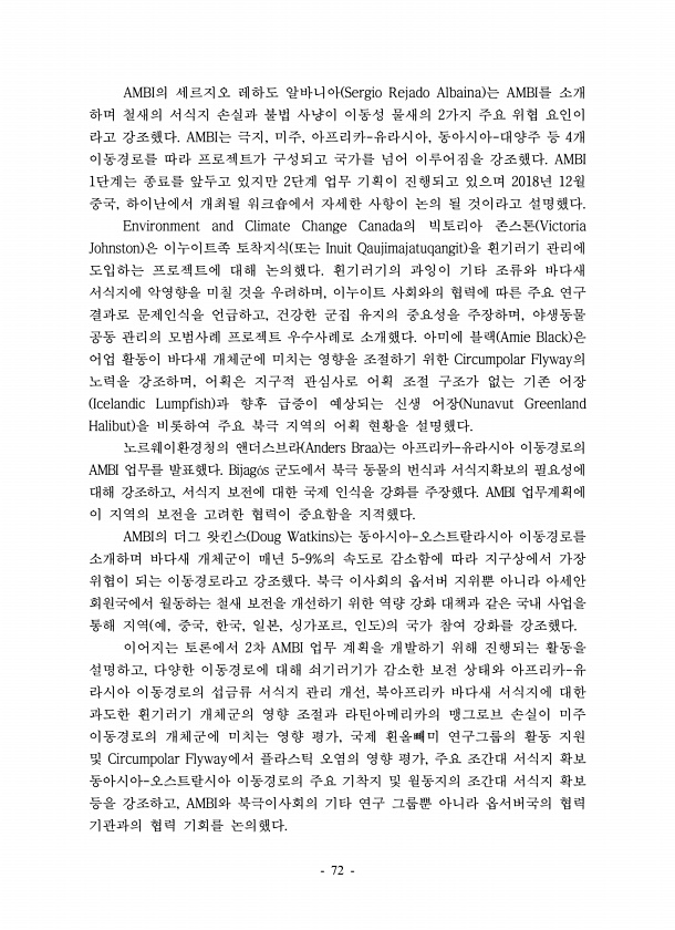 72 AMBI의 세르지오 레하도 알바니아 Sergio Rejado Albaina 는 AMBI를 소개 하며 철새의 서식지 손실과 불법 사냥이 이동성 물새의 2가지 주요 위협 요인이 라고 강조했다. AMBI는 극지, 미주, 아프리카-유라시아, 동아시아-대양주 등 4개 이동경로를 따라 프로젝트가 구성되고 국가를 넘어 이루어짐을 강조했다. AMBI 1단계는 종료를 앞두고 있지만 2단계 업무 기획이 진행되고 있으며 2018년 12월 중국, 하이난에서 개최될 워크숍에서 자세한 사항이 논의 될 것이라고 설명했다. Environment and Climate Change Canada의 빅토리아 존스톤 Victoria Johnston 은 이누이트족 토착지식 또는 Inuit Qaujimajatuqangit 을 흰기러기 관리에 ...