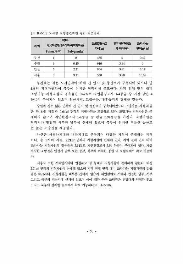 60 지역 제3차 전국자연환경조사자료 지형자원 보행로/등산로 길이 ㎞ 전국자연환경조 사평균등급 조망가능 면적ha/ ㎢ Point 개수 Polygon ㎢ 부천 4 0 435 4 0.47 수원 6 0.45 910 3.94 0 안산 5 2.21 904 3.91 3.14 시흥 0 9.11 530 3.98 10.66 [표 Ⅱ-3-10] 도시형 지형경관자원 평가 최종결과 부천에는 작은 도시면적에 비해 긴 인도 및 등산로가 구축되어 있으나 단 4개의 지형자원만이 북부에 위치한 경작지에 분포한다. 지역 전체 면적 대비 조망가능 지형자원의 점유율은 0.47%로 자연환경조사 1-4등급 중 가장 낮은 4 등급이 부여되어 있으며 인공제방, 고립구릉, 배후습지의 형태를 갖는다. 수원의 경우 넓은 면적에 긴 인도 및 등산로가 구축되...