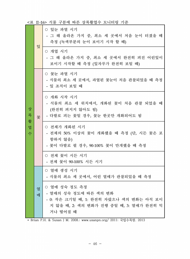 46 표 Ⅱ-16 식물 구분에 따른 상록활엽수 모니터링 기준 상 록 활 엽 수 잎 ○ 잎눈 파열 시기 그 해 올라온 가지 중, 최소 세 곳에서 처음 눈이 터졌을 때 측정 녹색부분의 눈이 보이기 시작 할 때 ○ 개엽 시기 그 해 올라온 가지 중, 최소 세 곳에서 완전히 펴진 어린잎이 보이기 시작할 때 측정 잎자루가 완전히 보일 때 꽃 ○ 꽃눈 파열 시기 식물의 최소 세 곳에서, 파열된 꽃눈이 처음 관찰되었을 때 측정 잎 조직이 보일 때 ○ 개화 시작 시기 식물의 최소 세 위치에서, 개화된 꽃이 처음 관찰 되었을 때 완전히 펴지지 않아도 됨 다발로 피는 꽃일 경우, 꽃눈 한곳만 개화되어도 됨 ○ 전체가 개화된 시기 전체의 50% 이상의 꽃이 개화했을 때 측정 단, 시든 꽃은 포 함하지 않음 꽃이 다발로 필 경우...