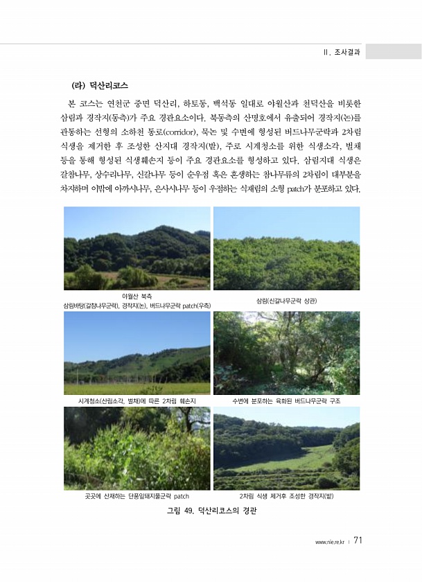Ⅱ. 조사결과 www.nie.re.kr ? 71 라 덕산리코스 본 코스는 연천군 중면 덕산리, 하토동, 백석동 일대로 야월산과 천덕산을 비롯한 삼림과 경작지 동측 가 주요 경관요소이다. 북동측의 산명호에서 유출되어 경작지 논 를 관통하는 선형의 소하천 통로 corridor , 묵논 및 수변에 형성된 버드나무군락과 2차림 식생을 제거한 후 조성한 산지대 경작지 밭 , 주로 시계청소를 위한 식생소각, 벌채 등을 통해 형성된 식생훼손지 등이 주요 경관요소를 형성하고 있다. 삼림지대 식생은 갈참나무, 상수리나무, 신갈나무 등이 순우점 혹은 혼생하는 참나무류의 2차림이 대부분을 차지하며 이밖에 아까시나무, 은사시나무 등이 우점하는 식재림의 소형 patch가 분포하고 있다. 야월산 북측 삼림바탕 갈참나무군락 , 경작지...