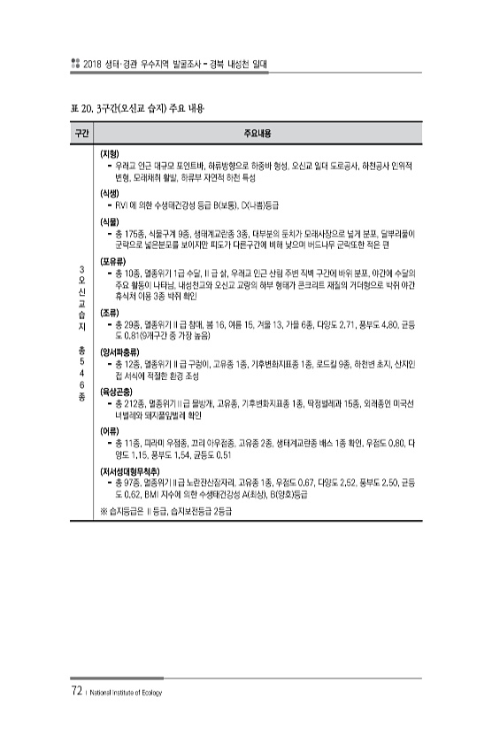 2018 생태·경관 우수지역 발굴조사 경북 내성천 일대 72 ? National Institute of Ecology 구간 주요내용 3 오 신 교 습 지 총 5 4 6 종 지형 우래교 인근 대규모 포인트바, 하류방향으로 하중바 형성, 오신교 일대 도로공사, 하천공사 인위적 변형, 모래채취 활발, 하류부 자연적 하천 특성 식생 RVI 에 의한 수생태건강성 등급 B 보통 , D 나쁨 등급 식물 총 175종, 식물구계 9종, 생태계교란종 3종, 대부분의 둔치가 모래사장으로 넓게 분포, 달뿌리풀이 군락으로 넓은분포를 보이지만 피도가 다른구간에 비해 낮으며 버드나무 군락또한 적은 편 포유류 총 10종, 멸종위기 1급 수달, II 급 삵, 우래교 인근 산림 주변 직벽 구간에 바위 분포, 야간에 수달의 주요 활동이 나타...