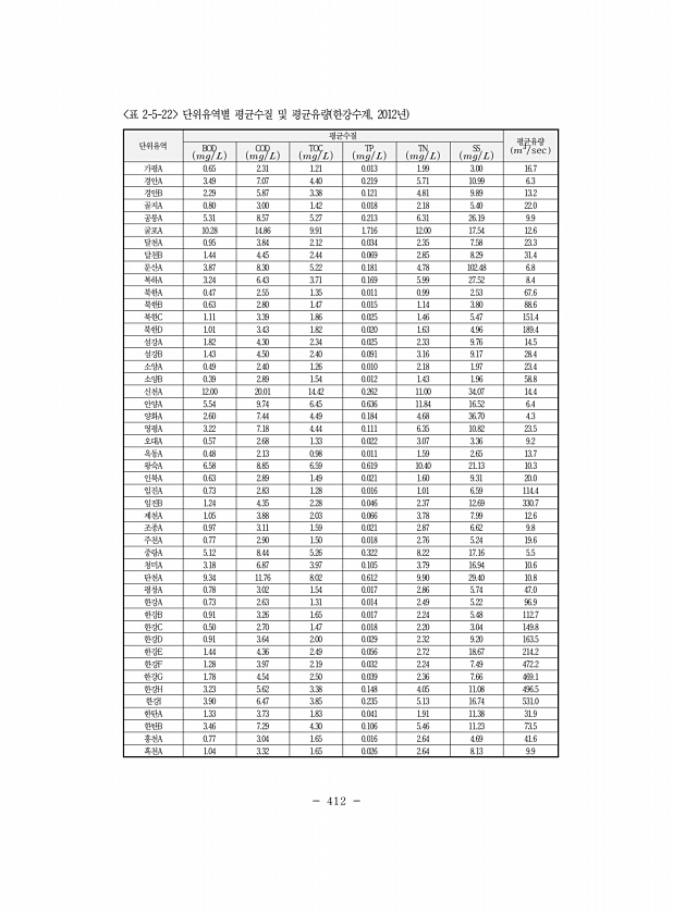 412 단위유역 평균수질 평균유량 BOD ?sec ?? ?? COD ?? TOC ?? TP ?? TN ??SS 가평A 0.65 2.31 1.21 0.013 1.99 3.00 16.7 경안A 3.49 7.07 4.40 0.219 5.71 10.99 6.3 경안B 2.29 5.87 3.38 0.121 4.81 9.89 13.2 골지A 0.80 3.00 1.42 0.018 2.18 5.40 22.0 공릉A 5.31 8.57 5.27 0.213 6.31 26.19 9.9 굴포A 10.28 14.86 9.91 1.716 12.00 17.54 12.6 달천A 0.95 3.84 2.12 0.034 2.35 7.58 23.3 달천B 1.44 4.45 2.44 0.069 2...