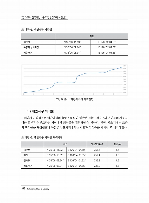 2018 전국해안사구 자연환경조사 전남Ⅰ 70 ? National Institute of Ecology 좌표 해안선 N 35°06′11.93″ E 126°04′04.59″ 측량기 설치지점 N 35°06′09.64″ E 126°04′04.52″ 배후사구 N 35°06′08.91″ E 126°04′04.66″ 표 대광-1. 단면측량 기준점 그림 대광-1. 대광사구의 대표단면 해안사구 퇴적물은 해안단면의 측량선을 따라 해안선, 해빈, 전사구의 전면부의 사초지 대와 목본류가 분포하는 지역에서 퇴적물을 채취하였다. 해안선, 해빈, 사초지대는 표층 의 퇴적물을 채취했으나 목본류 분포지역에서는 낙엽과 부식층을 제거한 후 채취하였다. 좌표 평균입도 ㎛ 분급 ㎛ 해안선 N 35°06′11.93″ E 126°04′04.59″...