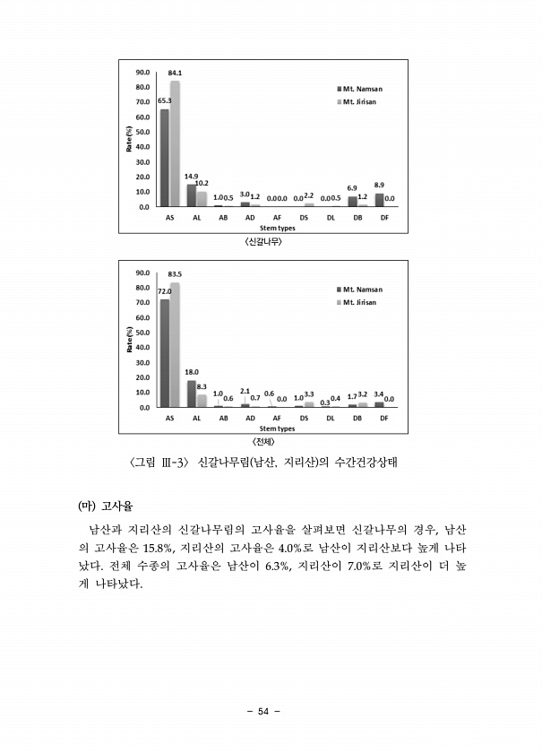54 신갈나무 전체 그림 Ⅲ-3 신갈나무림 남산, 지리산 의 수간건강상태 마 고사율 남산과 지리산의 신갈나무림의 고사율을 살펴보면 신갈나무의 경우, 남산 의 고사율은 15.8%, 지리산의 고사율은 4.0%로 남산이 지리산보다 높게 나타 났다. 전체 수종의 고사율은 남산이 6.3%, 지리산이 7.0%로 지리산이 더 높 게나타났다.