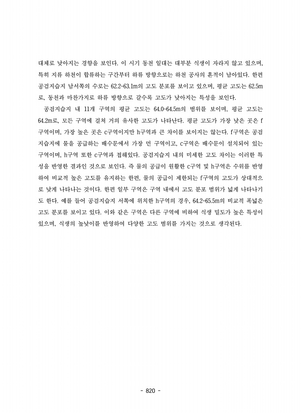 820 대체로 낮아지는 경향을 보인다. 이 시기 동천 일대는 대부분 식생이 자라지 않고 있으며, 특히 지류 하천이 합류하는 구간부터 하류 방향으로는 하천 공사의 흔적이 남아있다. 한편 공검지습지 남서쪽의 수로는 62.263.1m의 고도 분포를 보이고 있으며, 평균 고도는 62.5m 로, 동천과 마찬가지로 하류 방향으로 갈수록 고도가 낮아지는 특성을 보인다. 공검지습지 내 11개 구역의 평균 고도는 64.064.5m의 범위를 보이며, 평균 고도는 64.2m로, 모든 구역에 걸쳐 거의 유사한 고도가 나타난다. 평균 고도가 가장 낮은 곳은 f 구역이며, 가장 높은 곳은 c구역이지만 h구역과 큰 차이를 보이지는 않는다. f구역은 공검 지습지에 물을 공급하는 배수문에서 가장 먼 구역이고, c구역은 배수문이 설치되어 ...