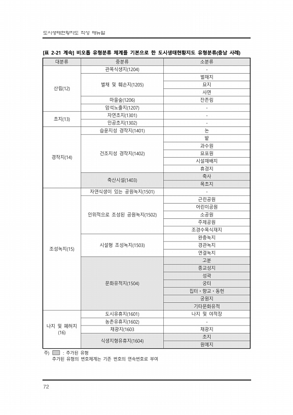 도시생태현황지도 작성 매뉴얼 72 대분류 중분류 소분류 산림 12 관목식생지 1204 벌채 및 훼손지 1205 벌채지 묘지 사면 마을숲 1206 잔존림 암석노출지 1207 초지 13 자연초지 1301 인공초지 1302 경작지 14 습윤지성 경작지 1401 논 건조지성 경작지 1402 밭 과수원 묘포원 시설재배지 휴경지 축산시설 1403 축사 목초지 조성녹지 15 자연식생이 있는 공원녹지 1501 인위적으로 조성된 공원녹지 1502 근린공원 어린이공원 소공원 주제공원 조경수목식재지 시설형 조성녹지 1503 완충녹지 경관녹지 연결녹지 문화유적지 1504 고분 종교성지 성곽 궁터 집터ㆍ향교ㆍ동헌 궁원지 기타문화유적 나지 및 폐허지 16 도시유휴지 1601 나지 및 야적장 농촌유휴지 1602 채광지 1603 채광지...