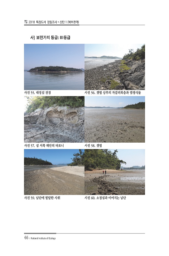 2018 특정도서 정밀조사 신안 1 북부권역 66 ? National Institute of Ecology 사진 55. 대정섬 전경 사진 56. 갯벌 상부의 자갈피복층과 염생식물 사진 57. 섬 서쪽 해안의 타포니 사진 58. 갯벌 사진 59. 남단에 발달한 사취 사진 60. 소정섬과 이어지는남단