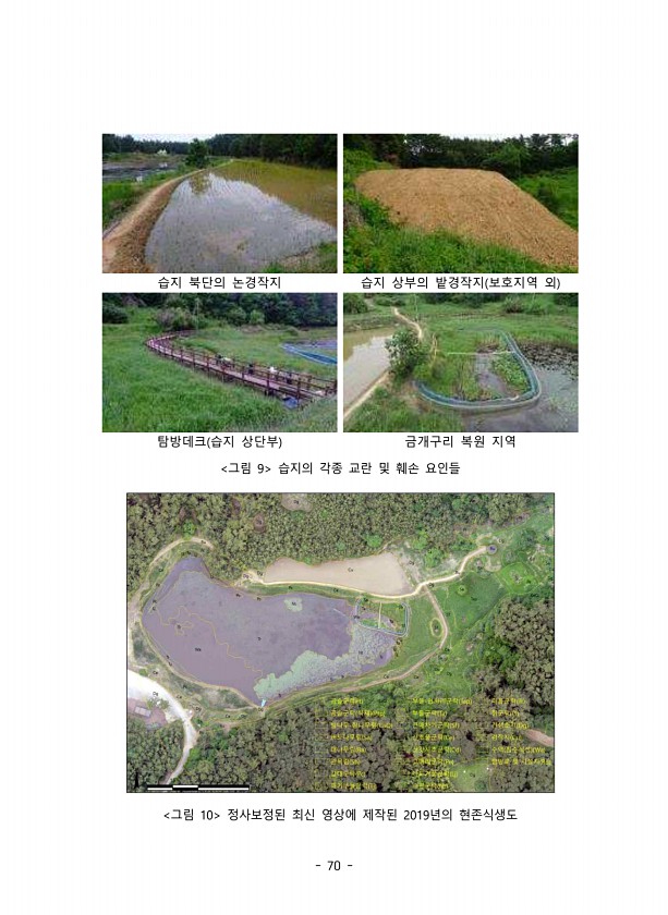 70 습지 북단의 논경작지 습지 상부의 밭경작지 보호지역 외 탐방데크 습지 상단부 금개구리 복원 지역 그림 9 습지의 각종 교란 및 훼손 요인들 그림 10 정사보정된 최신 영상에 제작된 2019년의현존식생도