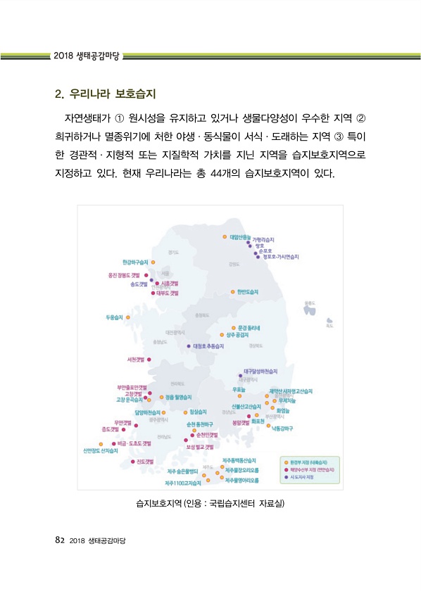 82 2018 생태공감마당 2. 우리나라 보호습지 자연생태가 ① 원시성을 유지하고 있거나 생물다양성이 우수한 지역 ② 희귀하거나 멸종위기에 처한 야생·동식물이 서식·도래하는 지역 ③ 특이 한 경관적·지형적 또는 지질학적 가치를 지닌 지역을 습지보호지역으로 지정하고 있다. 현재 우리나라는 총 44개의 습지보호지역이 있다. 습지보호지역 인용 국립습지센터 자료실