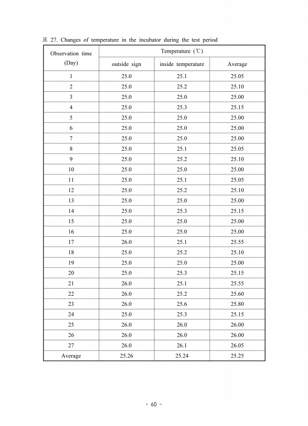 60 27. Changes of temperature in the incubator during the test period Observation time Day Temperature ℃ outside sign inside temperature Average 1 25.0 25.1 25.05 2 25.0 25.2 25.10 3 25.0 25.0 25.00 4 25.0 25.3 25.15 5 25.0 25.0 25.00 6 25.0 25.0 25.00 7 25.0 25.0 25.00 8 25.0 25.1 25.05 9 25.0 25.2 25.10 10 25.0 25.0 25.00 11 25.0 25.1 25.05 12 25.0 25.2 25.10 13 25.0 25.0 25.00 14 25.0 25.3 25.1...